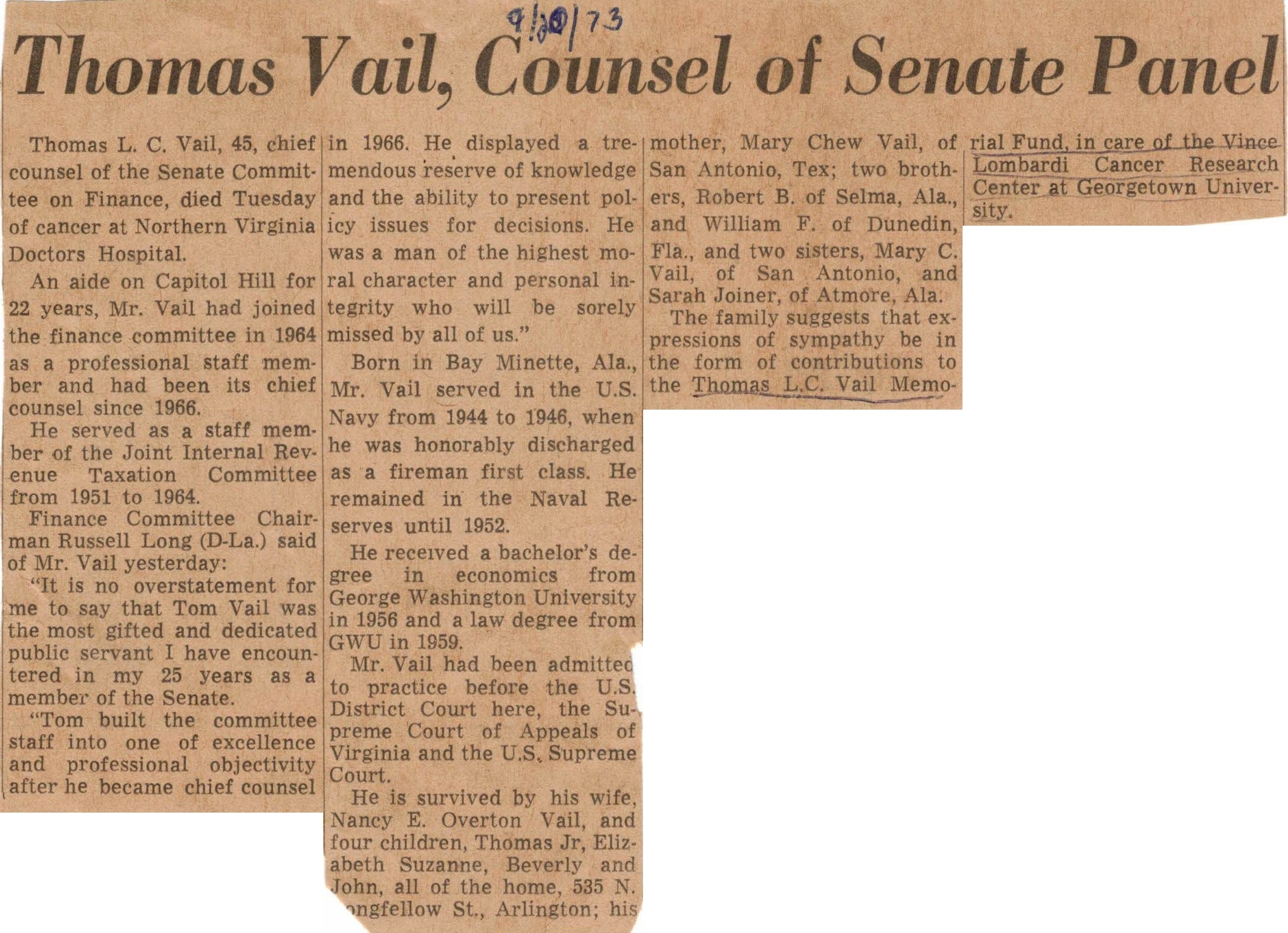 Tom Vail (Senior) died at the peak of his career.  He was known as a top expert in Tax Law, having worked in the US Congress on Tax Law for 22 years.  His position required that he be non-partisan.  He was respected as a professional by Congressmen, Senators, Governors and Cabinet Officials from both parties, as well as business leaders.